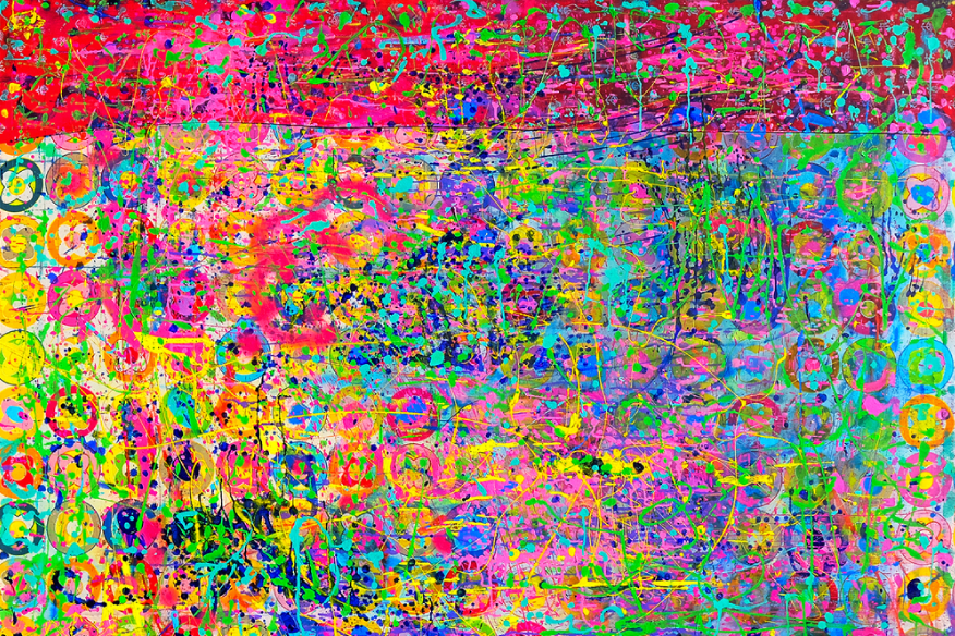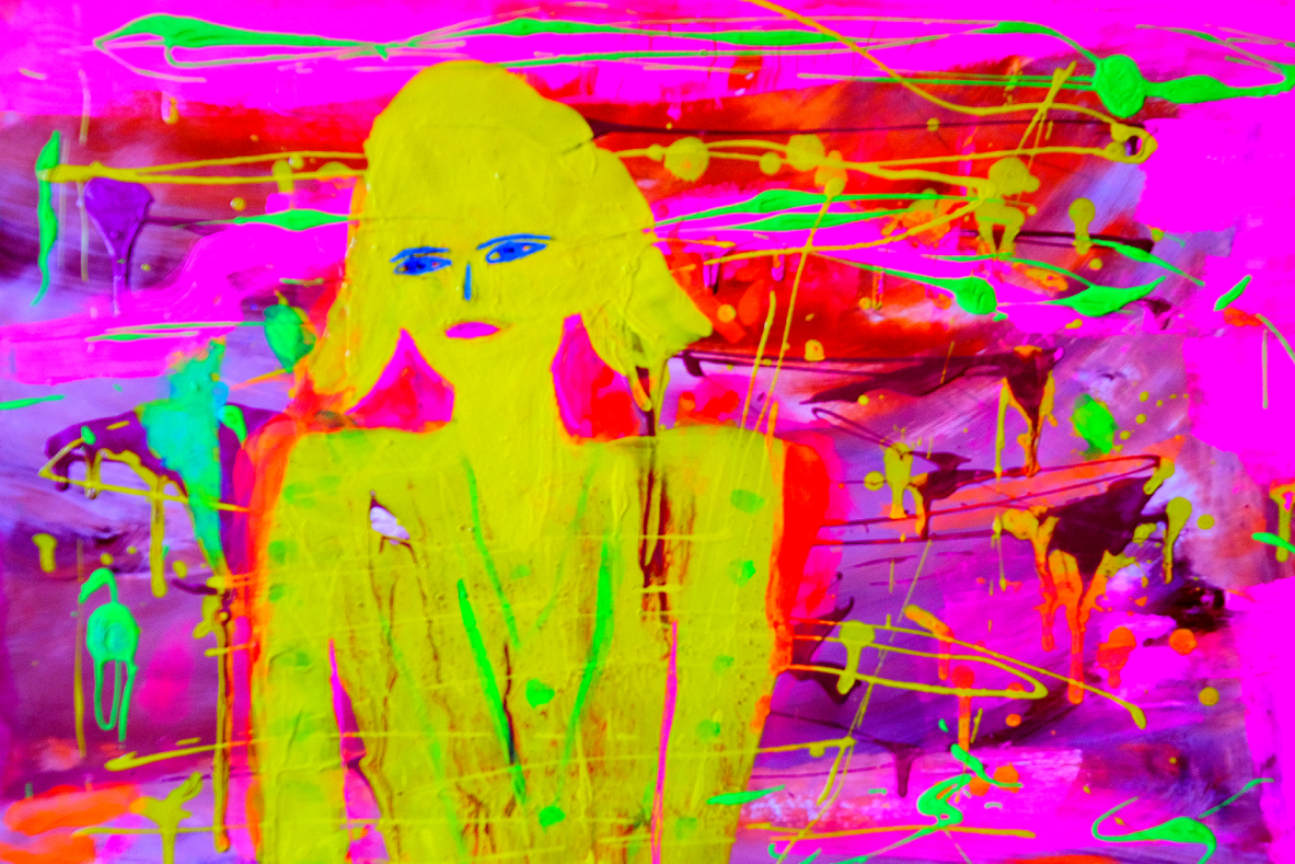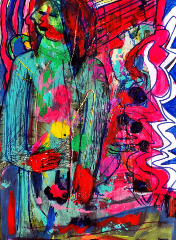 Charakteristisch für die Arbeitsweise von Joachim Pohlenk ist, dass er immer parallel auf zwei Ebenen arbeitet: die Malerei und die der Zeichnung. In einem ersten Schritt malt er den Hintergrund eines Bildes als freie Farbkomposition über mehrere Schichten, mit Verläufen und Tonabstufungen. In einem zweiten Schritt führt er dann die Zeichnung aus. Diese überträgt er mit Pinsel, Kugeschreiber oder Marker auf den Hintergrund. Die Figuren in seinen Bildern erscheinen also immer als Umriss oder als Schattenriss über einem farbigen Grund.